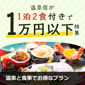 「1泊2食付きで1万円の温泉宿」特集ページでは、全国の温泉地で1泊2食付きの宿泊プランを1万円以下で提供している宿を厳選して紹介しています。